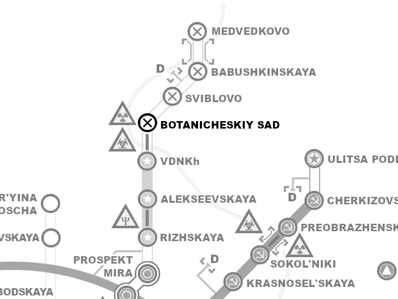 The Botanical Garden is the former home of the Dark Ones. Not much is known of the garden, as its only intact appearance is in the distance, near the end of Metro 2033. Regardless of the Artyom's choice in Metro 2033, the location's canon fate in Metro: Last Light (and thus Exodus) is destruction at the hands of a nuclear bomb.