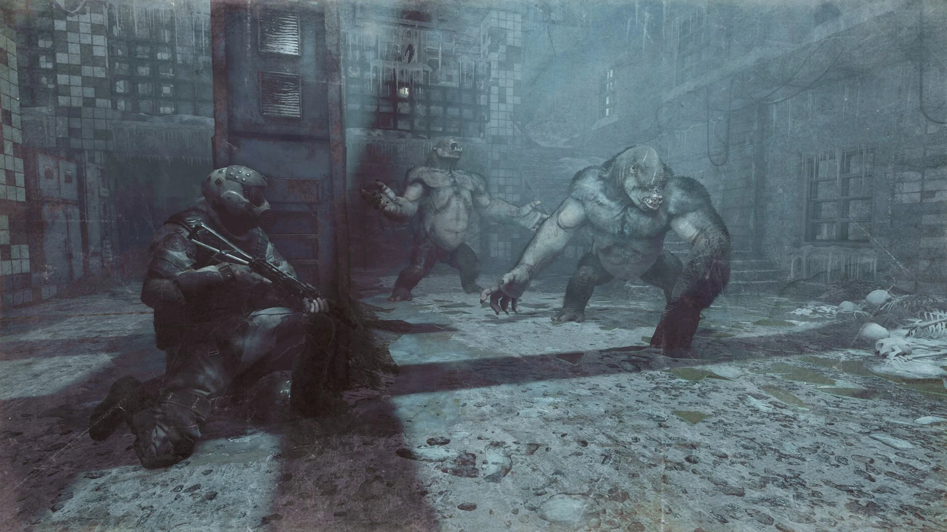 After exiting the underground area of the Dead City, Artyom will arrive to abandoned buildings which used to house the Akademgorodok Institute. Within these buildings, there will be giant, ape-like mutants called The Blind Ones that will attack the player if they make too much noise. These can be snuck past simply enough as they, as per their names, cannot see. The player must not harm any of them in any way while playing this section of the level. There are around five or six throughout the level and mostly can be avoided with ease, however the final two are located within the same small room that the player must find their way out of by activating an electrical panel.